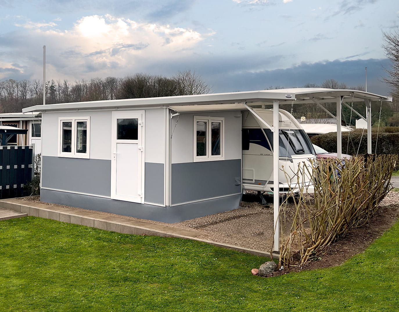 Unser Ganzjahresvorzelt ist ein selbststehendes und winterfestes Vorzelt für Dauercamper, das mit einer optionalen Rückwand auch ohne den Wohnwagen für sich allein stehen kann. Unser feststehendes Vorzelt wird nicht wie herkömmliche Vorzelte in die Kederschiene vom Wohnwagen eingezogen. Als Dauercamping-Vorzelt hält es aufgrund seiner massiven Bauweise aus Aluminium und hochfester Plane auch höhere Schneelasten und Sturm aus und lässt sich durch allerlei Zubehör wie feste Fenster und Türen oder einer zweiten Dachplane zur Schwitzwasserreduktion ganz individuell gestalten und so zu einem in sich abgeschlossenen Wohnraum bauen.